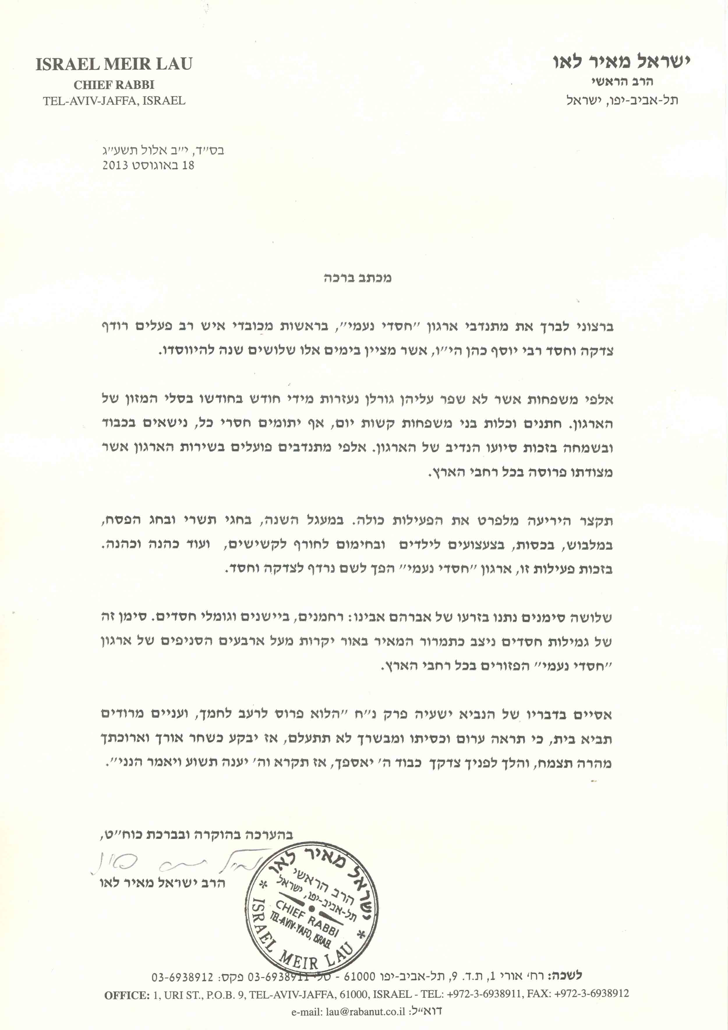 I would like to congratulate the volunteers of Chasdei Naomi – headed by the honored Rabbi Yosef Cohen, a man of wide-ranging activity and a tireless promoter of charitable causes and deeds of benevolence – on the thirtieth anniversary of the organization’s founding.
